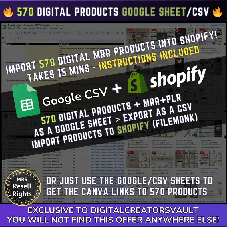 570 Digital Products Google Sheet CSV + Shopify Import files – Commercial Use – Plus Master resell rights MRR + PLR for the Products