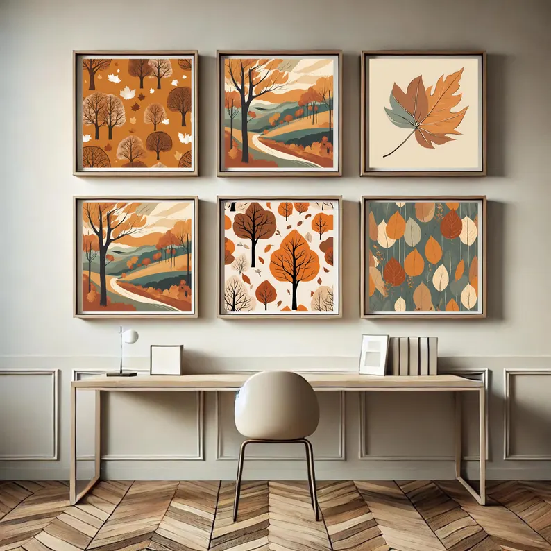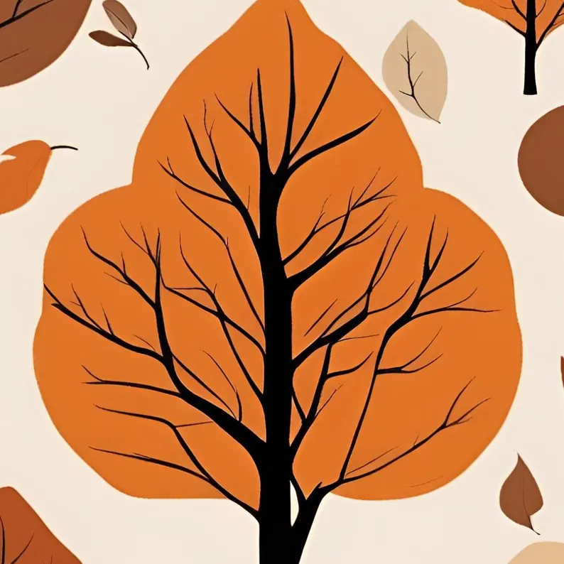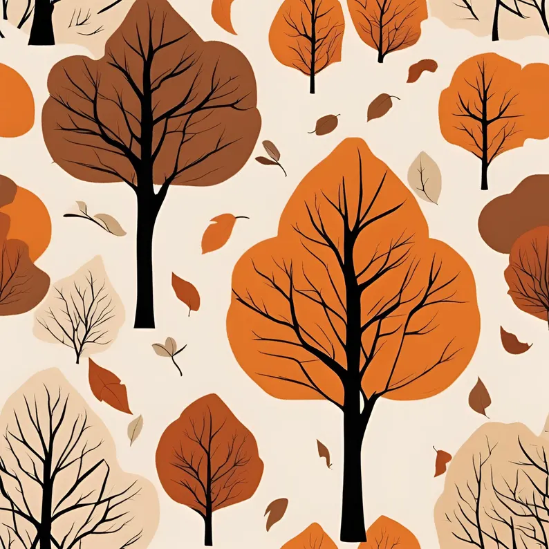 “This vintage-inspired autumn illustration features a pattern of beautifully minimalistic trees in warm shades of orange, brown, and beige. The simplicity of the tree branches and scattered leaves creates a calming fall atmosphere, perfect for bringing the cozy charm of the autumn season into your home. Ideal for fall-themed decor or nature-inspired artwork collections.”