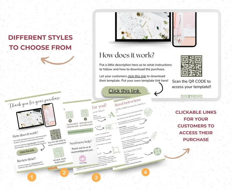 Whether you’re saving your products to an online file storage platform like Google or Dropbox or sharing a Canva template link, simply add your hyperlinks to these templates, edit the design to match your product and brand, download as a standard PDF to maintain the links and upload to Etsy or your own shop – simple!