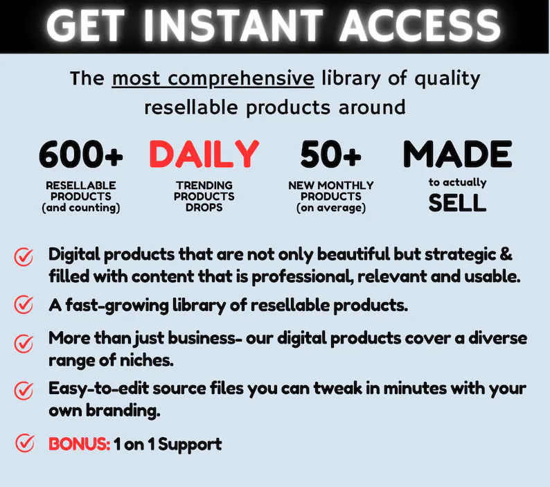 All our products are available as instant digital downloads, allowing you to access your purchases immediately after checkout. Get what you need instantly and start using it right away. You can resell each digital product as your own by rebranding them OR even resell the library access as-is for your audience, and keep 100% of the profits for yourself!