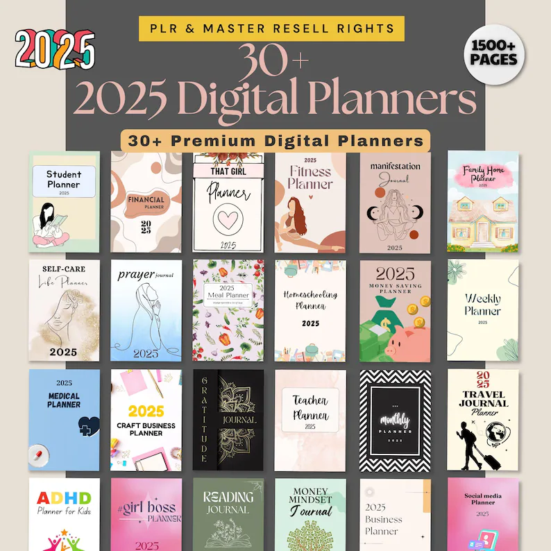 ✔️ 30+ Premium 2025 Digital Planners: Fully editable Canva templates covering niches like productivity, homeschooling, fitness, and more.